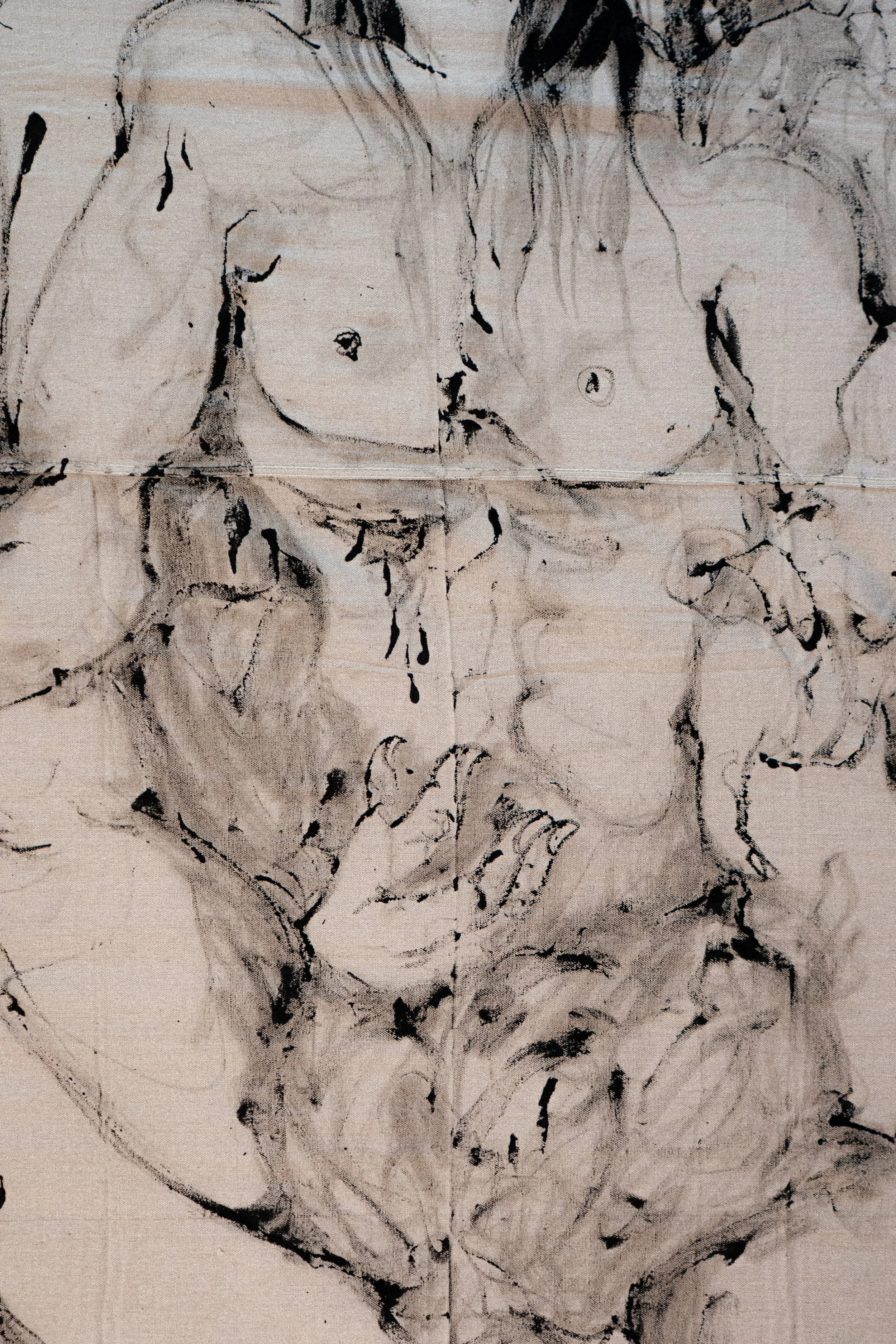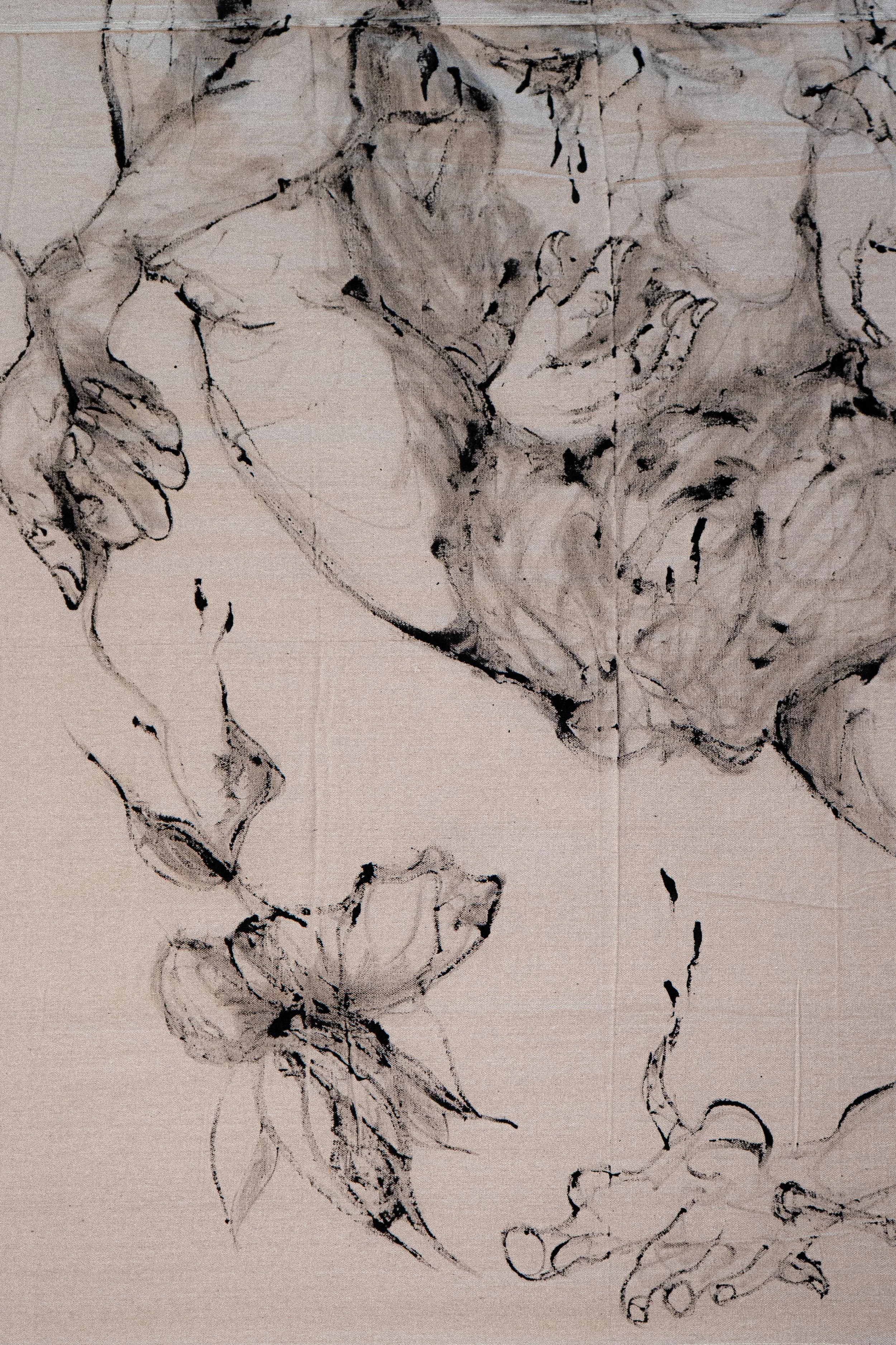 The choice of monochrome and raw canvas is not decorative austerity. By eliminating color, Moscoso eliminates illusion. Ink functions as primary substance — as vital fluid and, simultaneously, as an open wound that only fully closes within the imagination of the viewer. It is a deliberate, tactical decision not to stabilize volume. The lines do not enclose form; they hold it in a state of instability, suspended within the breathing space of the canvas.